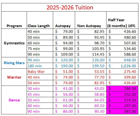 *Gymnastics & Warrior Fall Tuition: 9/6/2025 - 2/27/2026, Due to register *Gymnastics & Warrior, Spring Tuition: 2/28/2026- 8/21/2026, Due by 2/15/2026 * Dance Fall Tuition: 9/6/2025 - 1/30/2026, Due to register *Dance Spring Tuition: 1/31/2026 - 6/20/2026, Due by 1/15/2026 Fall Tuition Discount only available until 9/12/2025 with 10% discount Spring Tuition Discount only available until 2/15/2026 with 10% discount